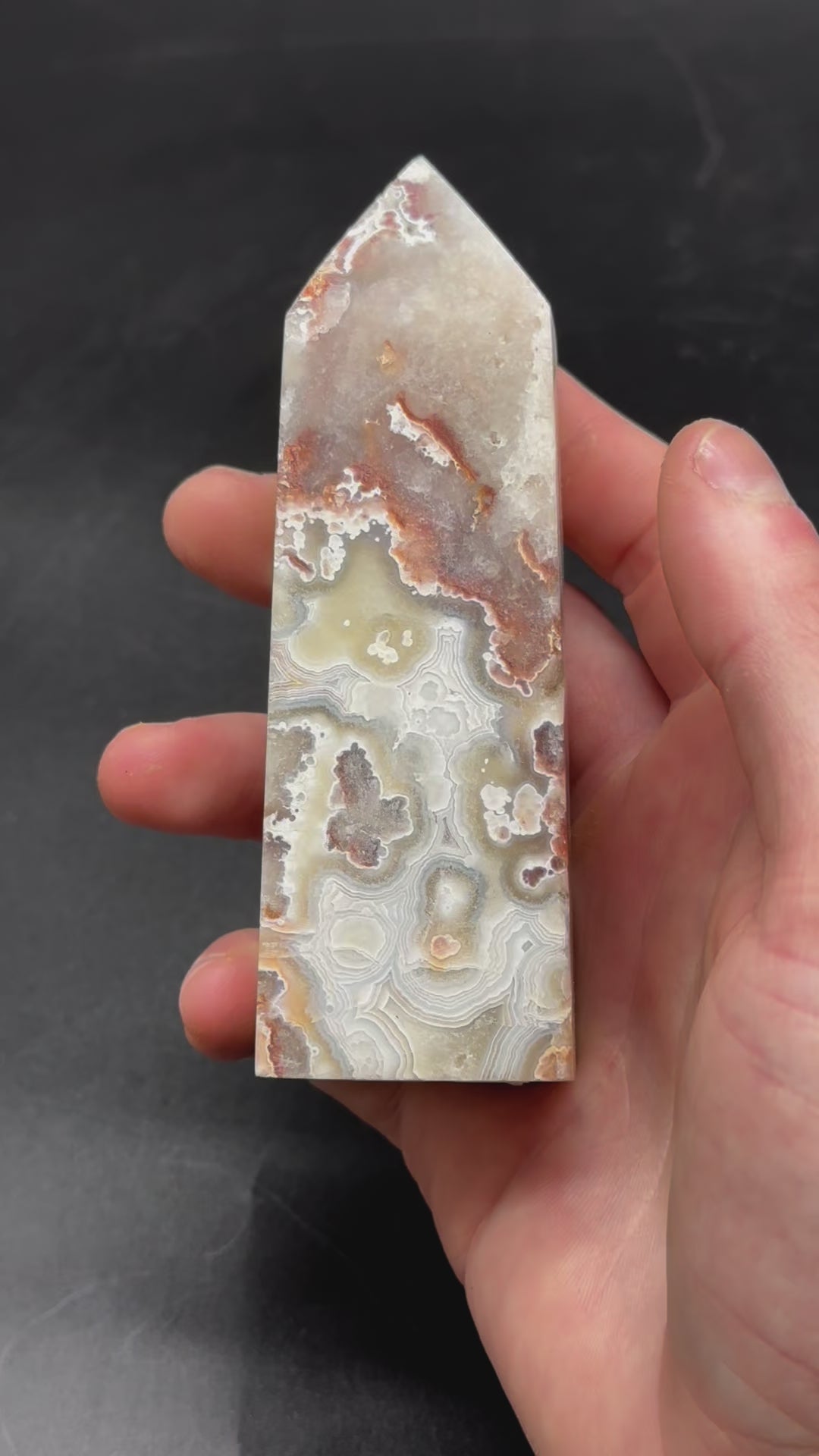 Crazy Lace Agate tower, 4.4-inch length.